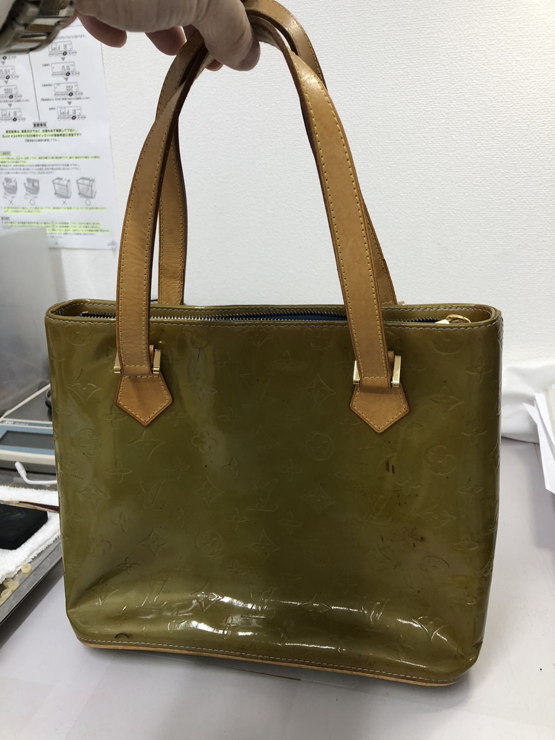 ルイヴィトン(LOUIS VUITTON)ヴェルニ ヒューストン ハンドバッグ のお持ち込みです。通常、ヴェルニの素材は、変色やヤケ、スレなどが多く発生しやすいお品物です。どんなに大事に使用されていても仕方のないことでもあります。お客様もその状態だったので、あまり期待されていないようでしたが、驚きの高額査定をさせて頂き、お喜びの様子でした。どのような状態でも出来る限りの査定をいたしますので、お捨てにならずにお持ち込み頂けたらと思います。