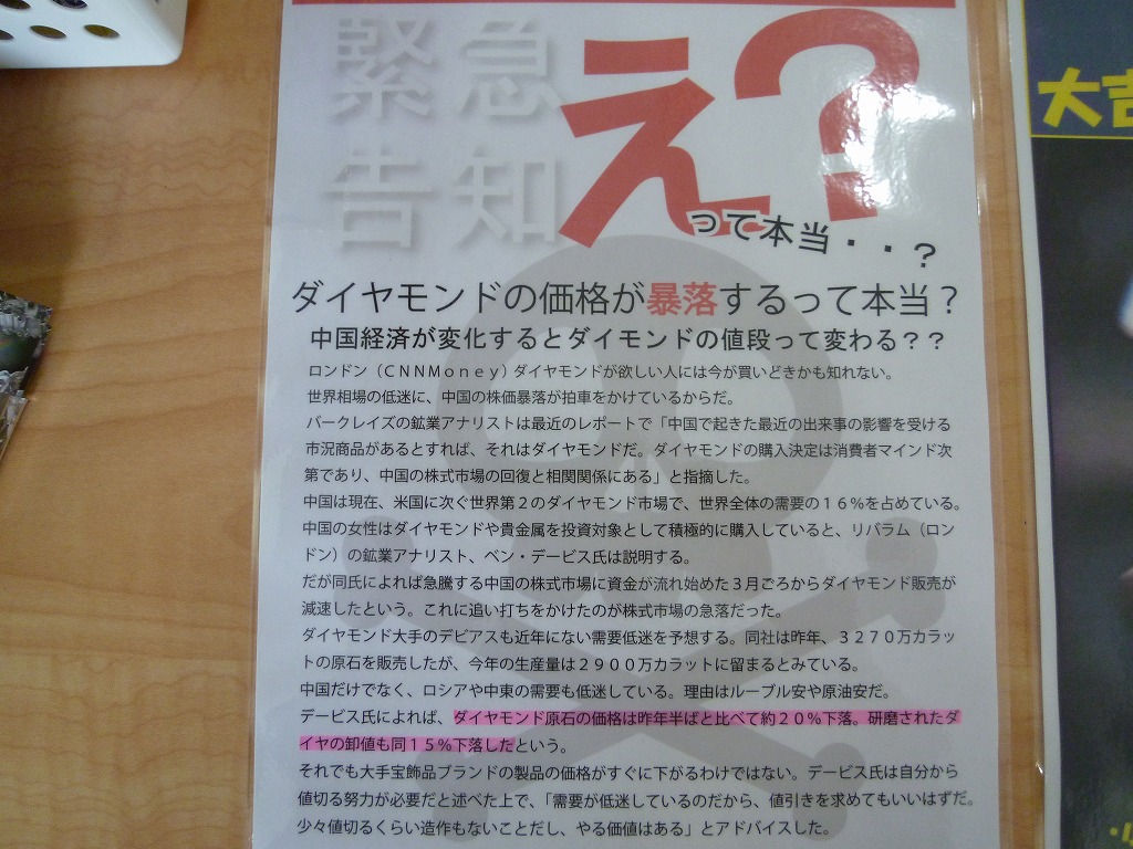 しかし、ダイヤモンド相場の下落がもっと進行すると、ダイヤモンドの買取りに自信のある買取り専門店大吉リーベル王寺店でも買い取り価格を下げざるを得ない状況になる事も考えられます。