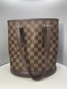 ダミエ柄にラズベリーレッドの裏地がポイントのバケツタイプのトートバッグ。取外しが可能なチェーン付きポーチが付属。ストラップ部分の長さが調整出来るのでハンドバッグとしても、ショルダーバッグとしても使用可能。