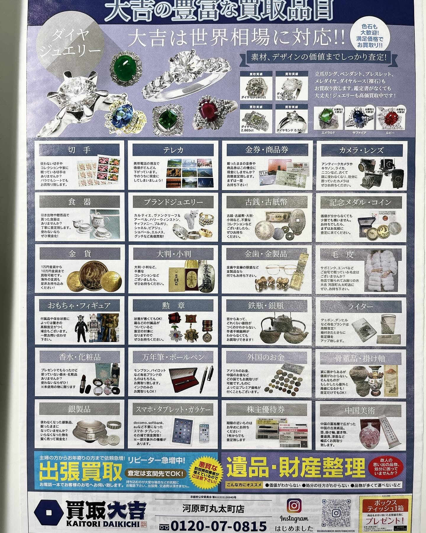 他にも時計、宝石、貴金属、ブランド品、記念硬貨、記念メダル、古銭、骨董品、テレカ、切手、金券、毛皮などもお取り扱いさせて頂いております😊