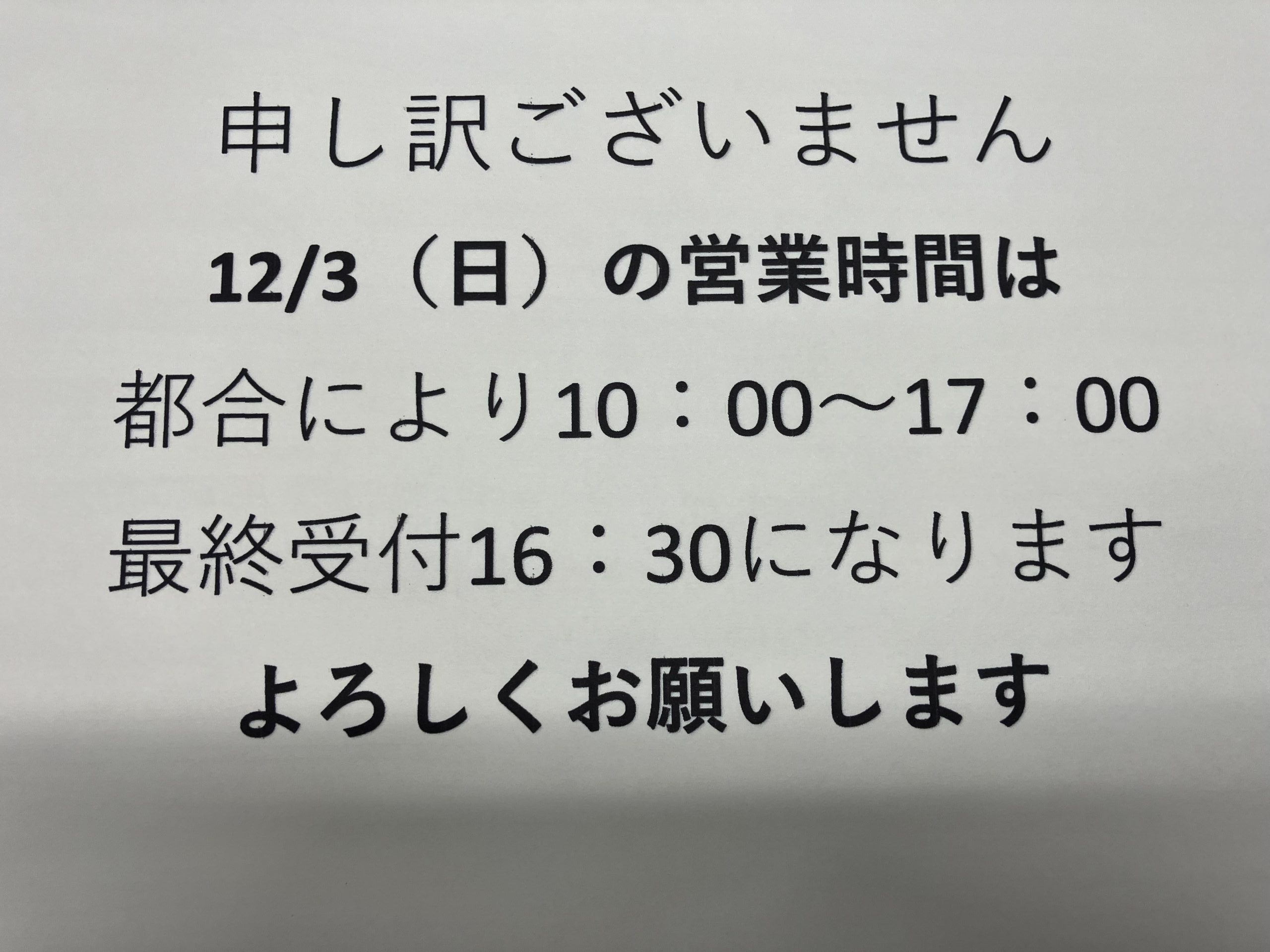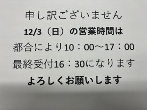 12/3(日)の営業時間のお知らせ【10:00~17:00】 | 久我山駅北口店