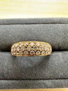 K18 ダイヤモンド1.89CT リング のお持ち込みです。ベースの貴金属がK18の為、昨今では高額査定となるデザインです。昔はプラチナのほうが高価だったので、婚約指輪などもプラチナが大半でした。このお品物は、メレダイヤの価値をどう判断するのかが査定のポイントです。石のクラリティを確かめつつ、金の総重量も加味して、お客様お喜びの高額査定となり、高価買取りさせて頂きました。なにかと年末は入用にもなりがちの季節ですので、ご不要になられた貴金属などは、ぜひ当店にお持ち込みください。「クリスマスキャンペーン」期間中は査定率UPしておりますので、ぜひこの機会にご利用ください。