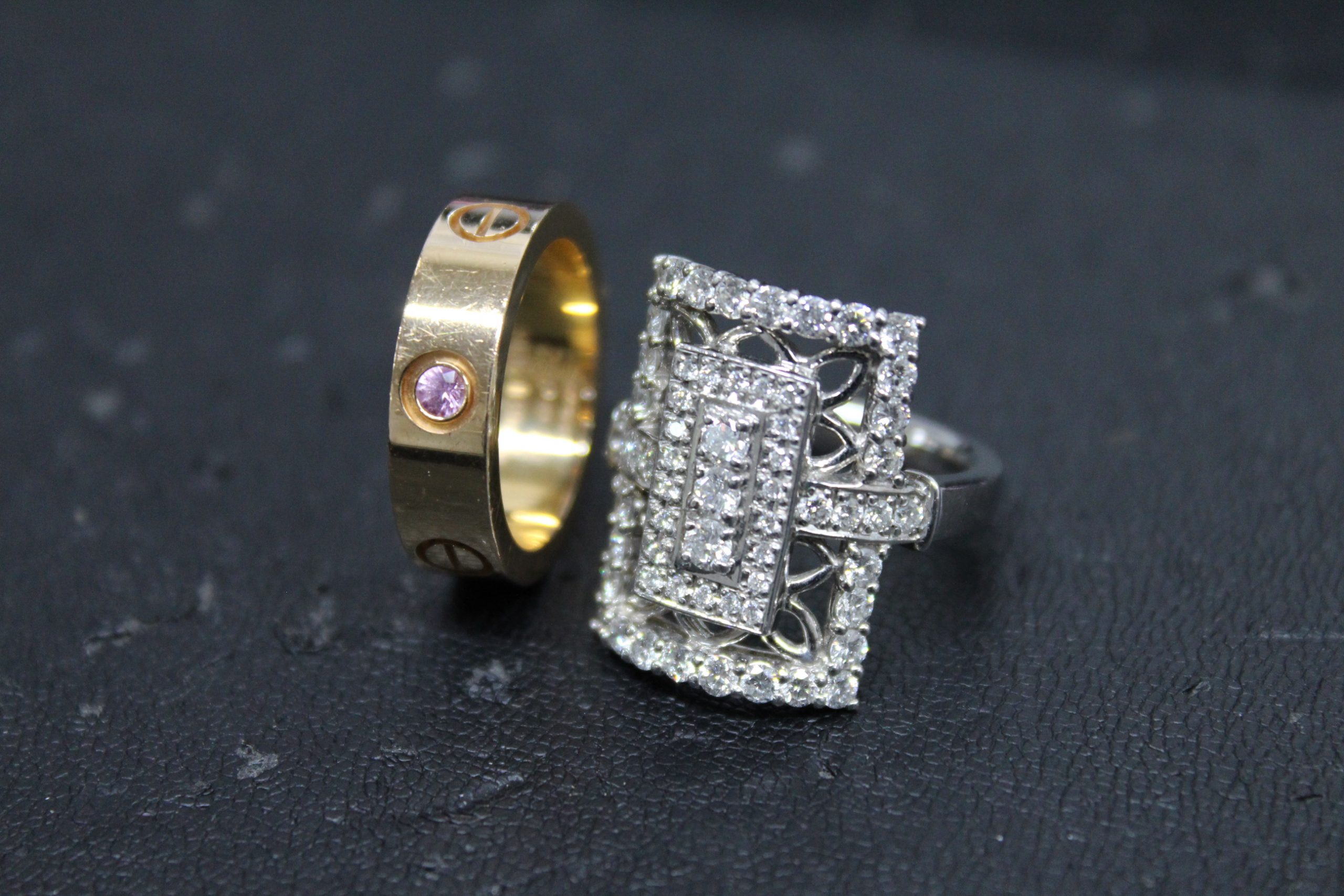 ピンクサファイア付カルティエのリングと、ノーブランドですがとてもゴージャスなダイヤ付き指輪です!