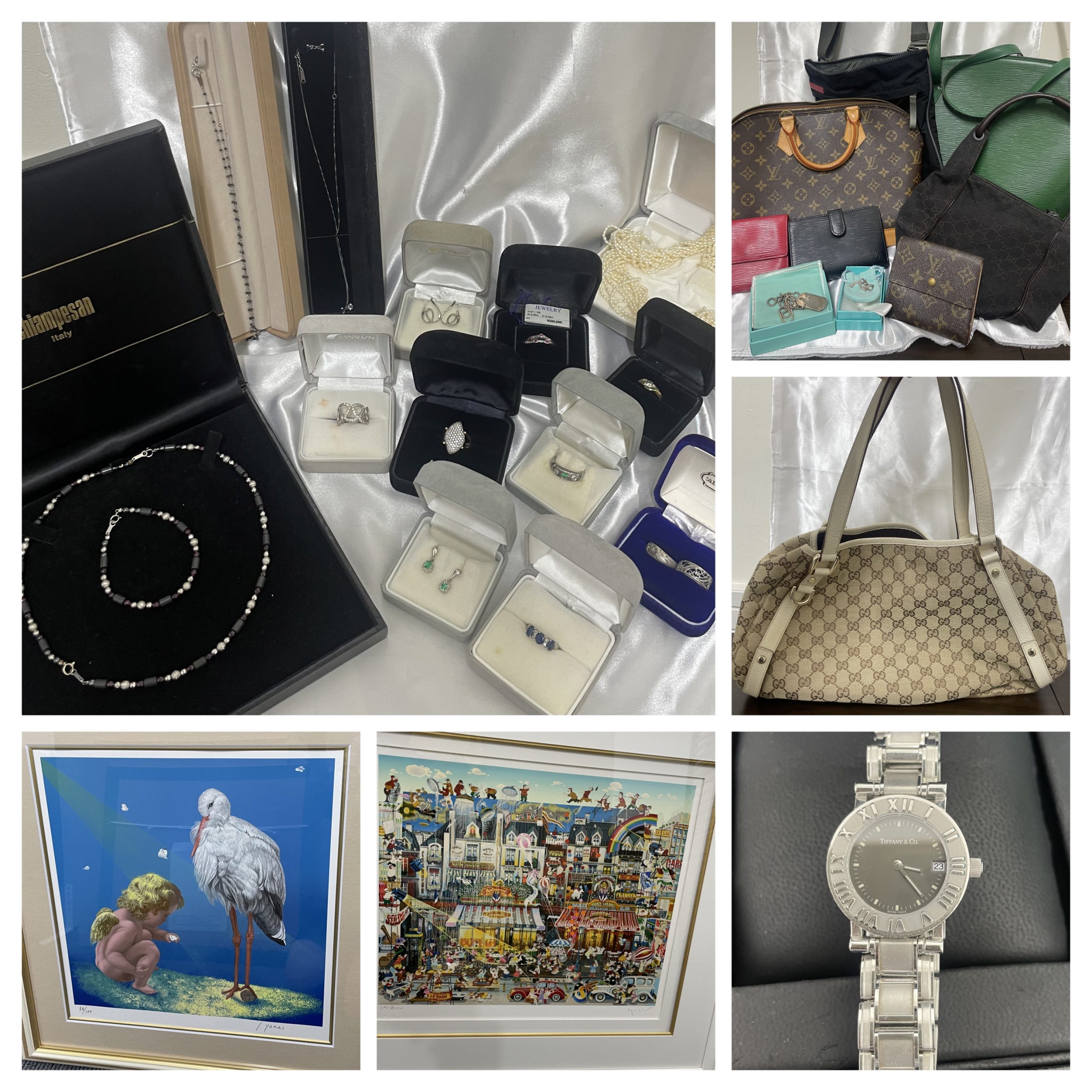 顧客様よりを沢山の18金ネックレス、プラチナネックレス、ダイヤモンドリング、Tiffanyの時計、ヒロヤマガタの絵画などをお買取りさせていただきました。(^^♪