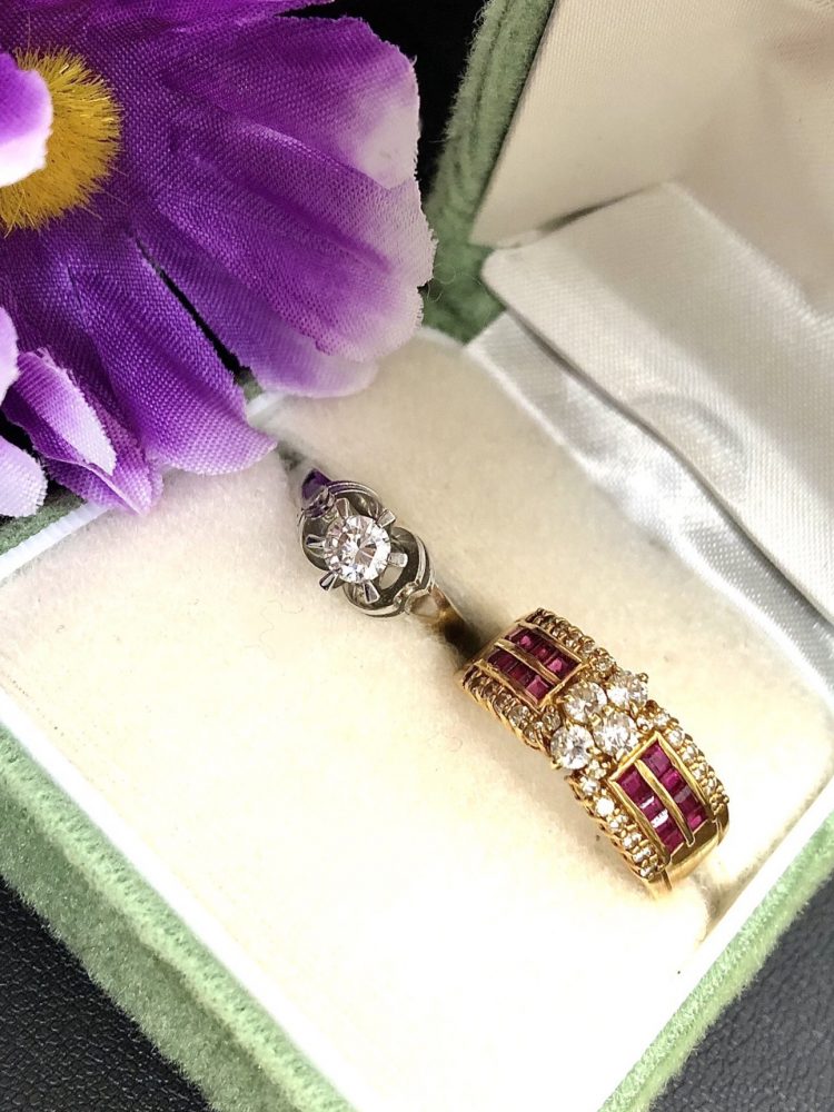 左側は立て爪ダイヤのプラチナリング、右側はダイヤとルビーがたくさん並んだ18金のリングです💕