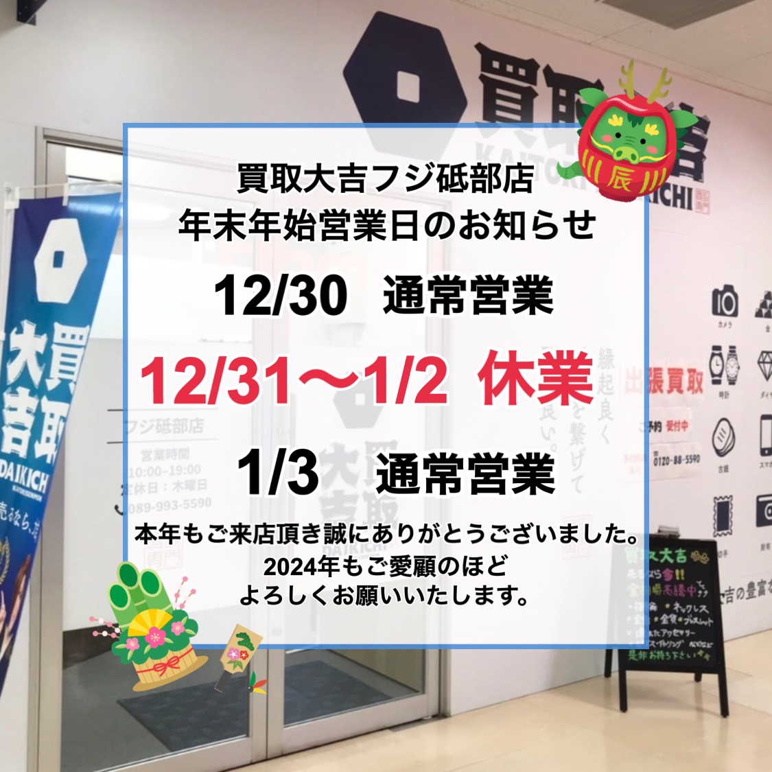 買取大吉» 店舗紹介» フジ砥部店» フジ砥部店 店長ブログ» 🌟年末年始の営業時間のお知らせ🌟