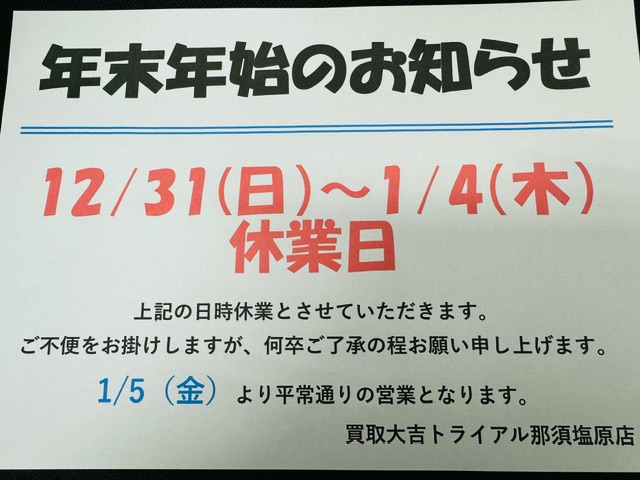 【年末のご挨拶】年末年始休業のお知らせ | トライアル那須塩原店