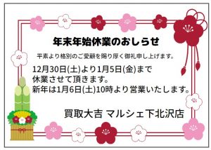 買取大吉» 店舗紹介» マルシェ下北沢店» マルシェ下北沢店 店長ブログ» 2023年の営業は本日12/29迄です。