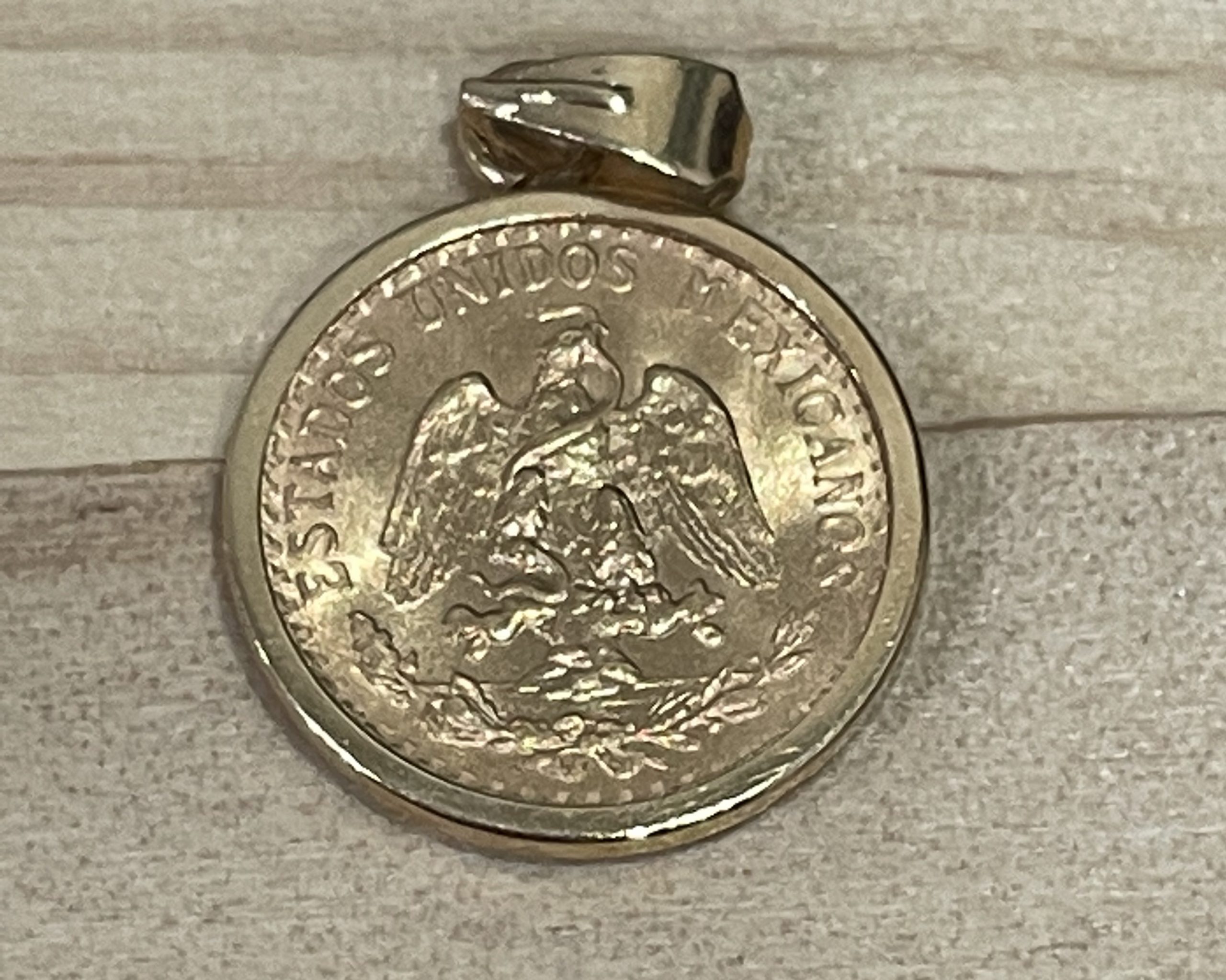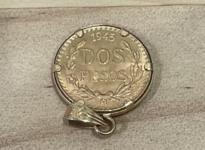 メキシコ政府が発行した金貨で、鷲と「DOS PESOS」の文字が刻まれています。
