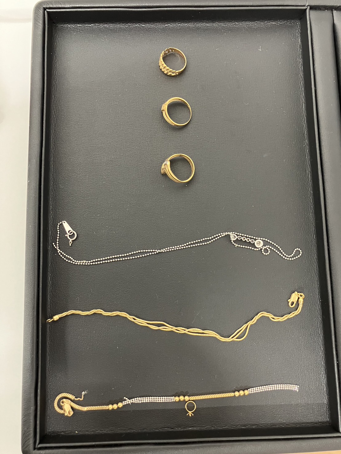 切れたブレスレット、ネックレス、指輪。