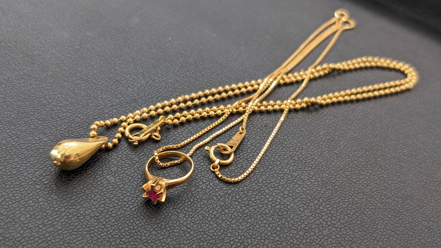 写真の様に貴金属で有れば、ネックレスをはじめ金のイヤリング、金のリング等、金ならどんな状態、