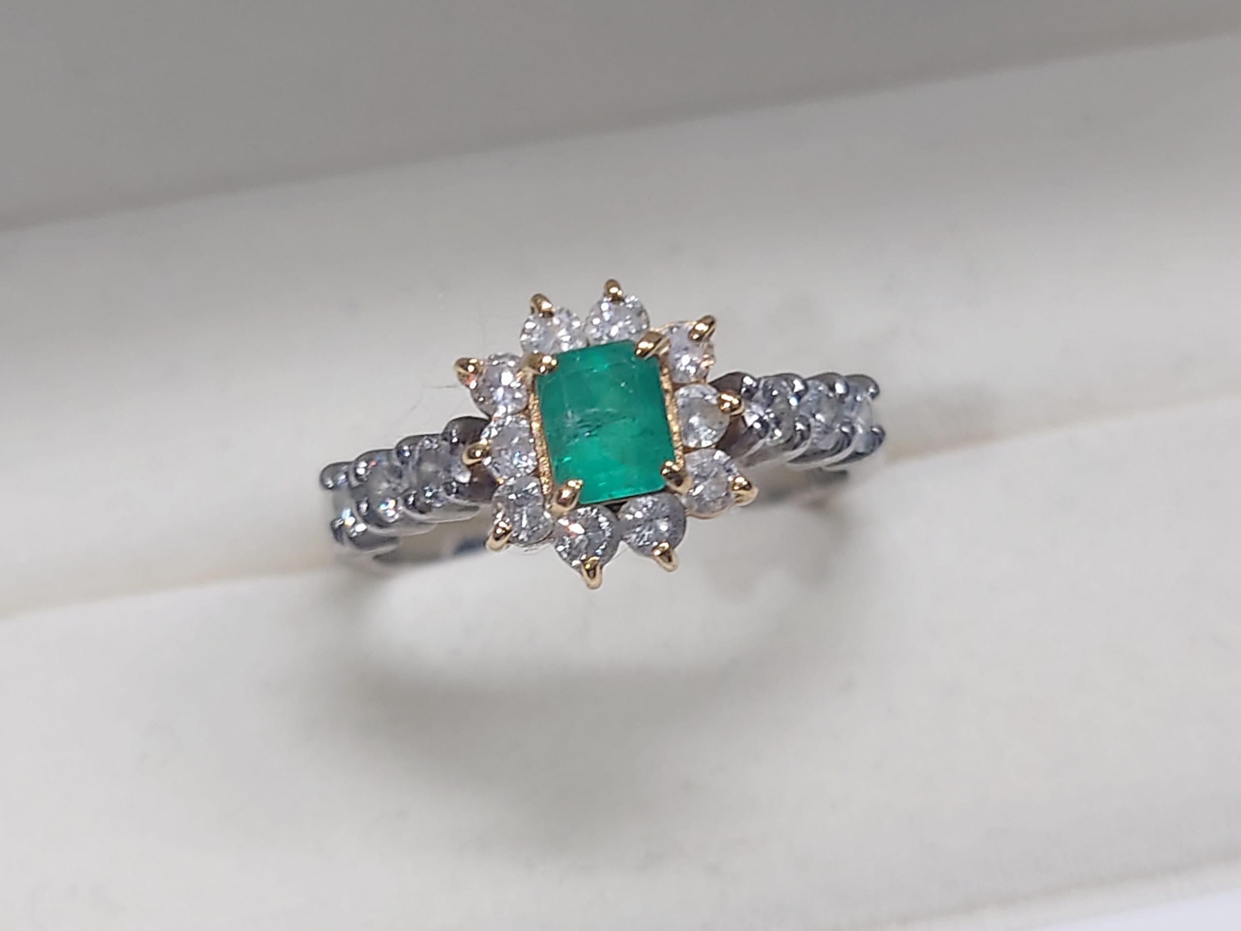 こちらプラチナとゴールドのリングにダイヤモンドとエメラルドの付いたジュエリーをお持ち頂きました☆