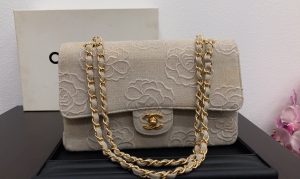 【CHANEL】キャンバスカメリアダブルフラップチェーンショルダーバッグです。 堂々たる気品と風格を持ったバッグです。年代の経過とともにキャンバス地にシミは散見されたもののとても素敵なお品物です。大吉シーマークスクエア店でお買取りさせて頂き誠にありがとうございました。