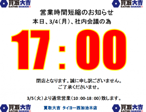 本日3/4(月)の姶良市・買取大吉タイヨー西加治木店、営業時間に関しまして | タイヨー西加治木店