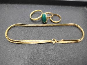 金のリング、石付きの金のリング、金のネックレスの買取をさせて頂きました。