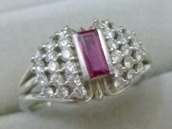 中央に色石が、両側に15個のメレダイヤが装飾されているプラチナ850(Pt850)のリングです。