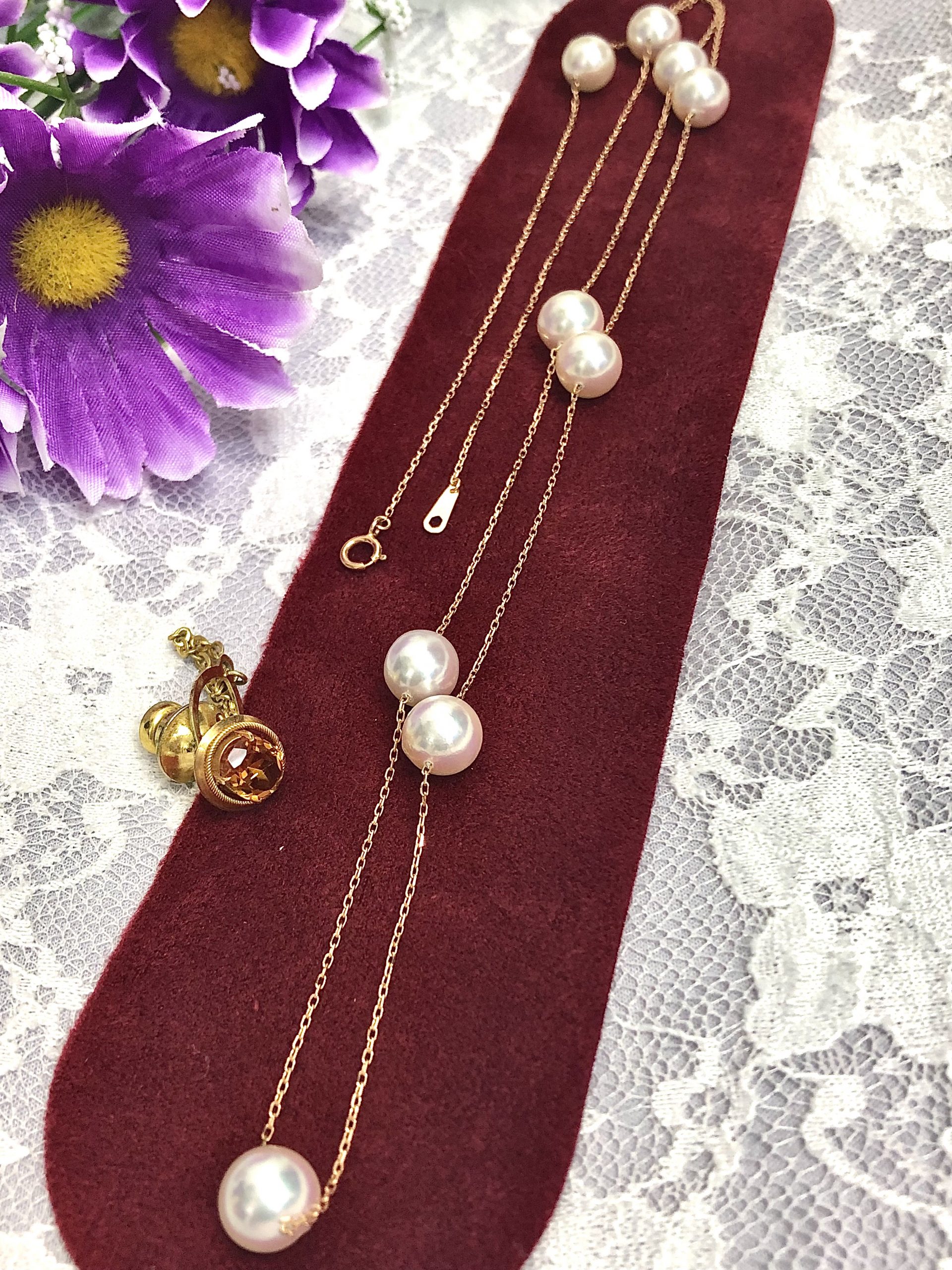 パールネックレスといえばパールが一周すべて連なったものが有名ですが、こちらはステーションネックレスと呼ばれるタイプのお品物。
