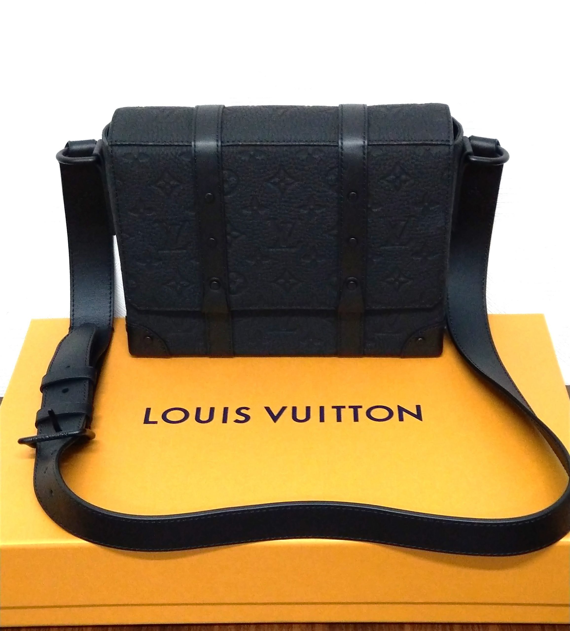 写真の【トランク メッセンジャー PM】は黒のモノグラムパターンのエンボス加工を施したショルダーバッグです。