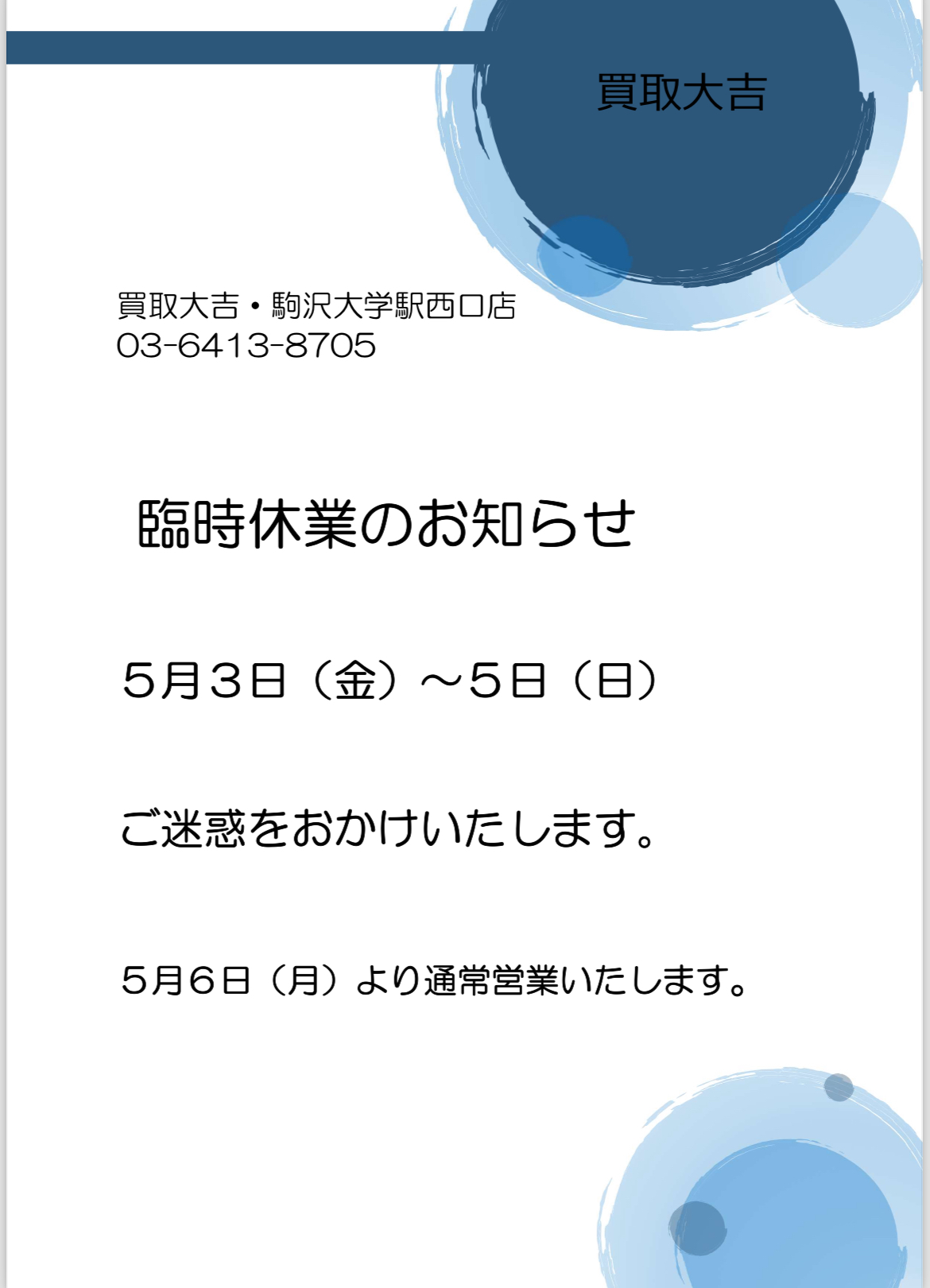 駒沢大学駅西口店は5月3日(金)から5日(日)まで臨時休業とさせていただきます。