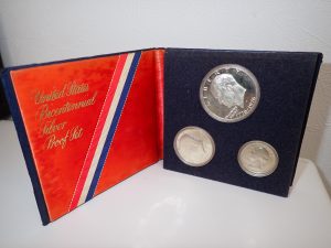 25¢銀貨、50¢銀貨、1ドル銀貨3種のプルーフセットです。