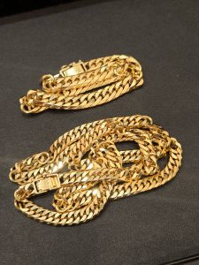 18金のネックレスとブレスレット、エメラルド、金とプラチナの指輪をお買い取りいたしました。