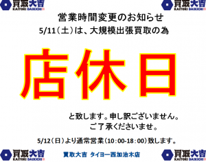 5/11(土)、姶良市・買取大吉タイヨー西加治木店、店頭の営業(店休)のお知らせ | タイヨー西加治木店