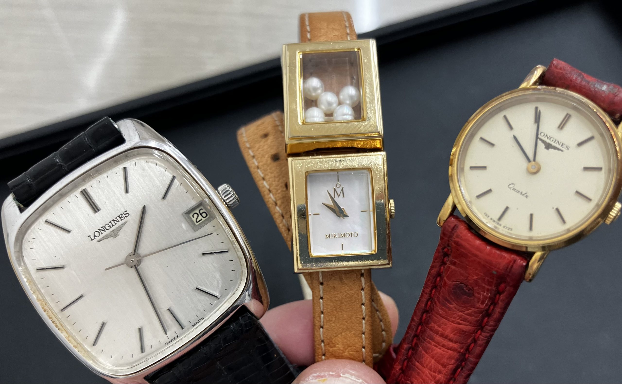 本日のお持ち込みの時計は、ミキモト製品とLONGINES製品です。
