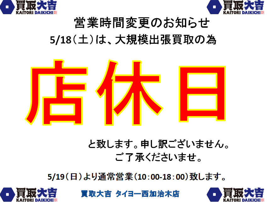 5/18(土)、姶良市・買取大吉タイヨー西加治木店、店頭の営業(店休)のお知ら | タイヨー西加治木店
