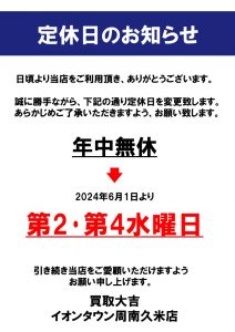 買取大吉» 店舗紹介» イオンタウン周南久米店» イオンタウン周南久米店 店長ブログ» 定休日変更のお知らせ
