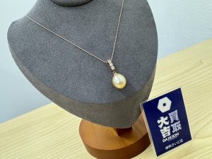 K18にゴールデンパールとMD0.23ctをあしらったネックレスになります
