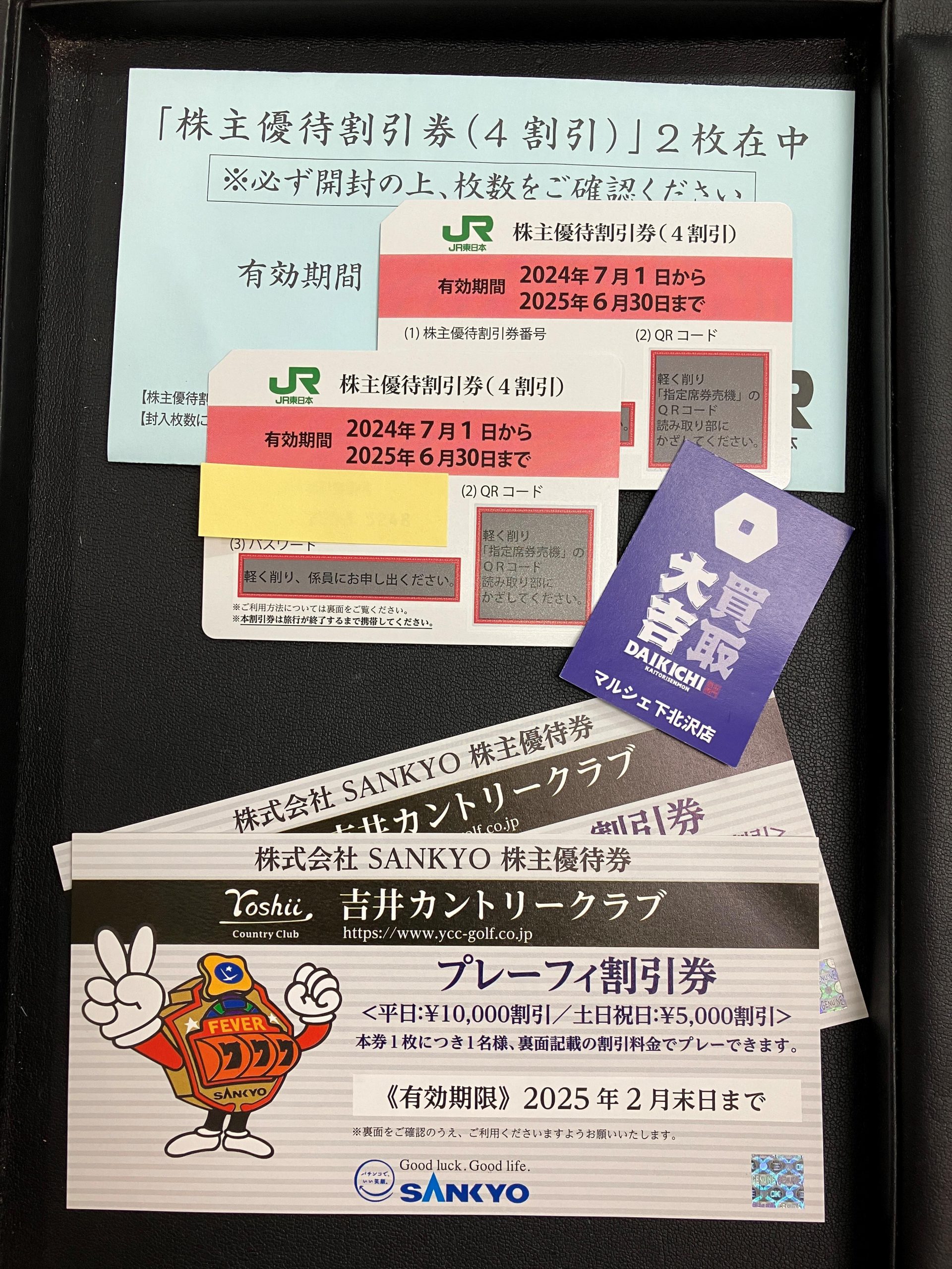 JR東日本の優待券と遊技機メーカーSANKYOの優待券をお買取致しました。