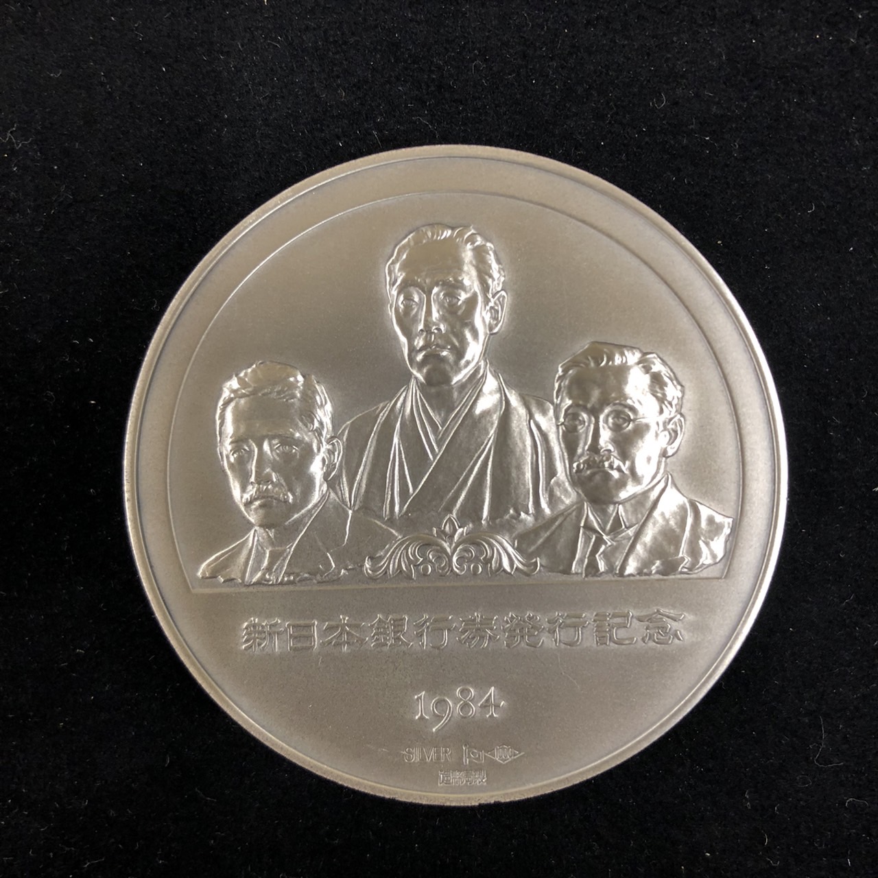 1984年11月1日に新紙幣としてなじみ深い福沢諭吉の1万円札、新渡戸稲造の5000円札、夏目漱石の1000円札が発行された記念に作られたメダルです。