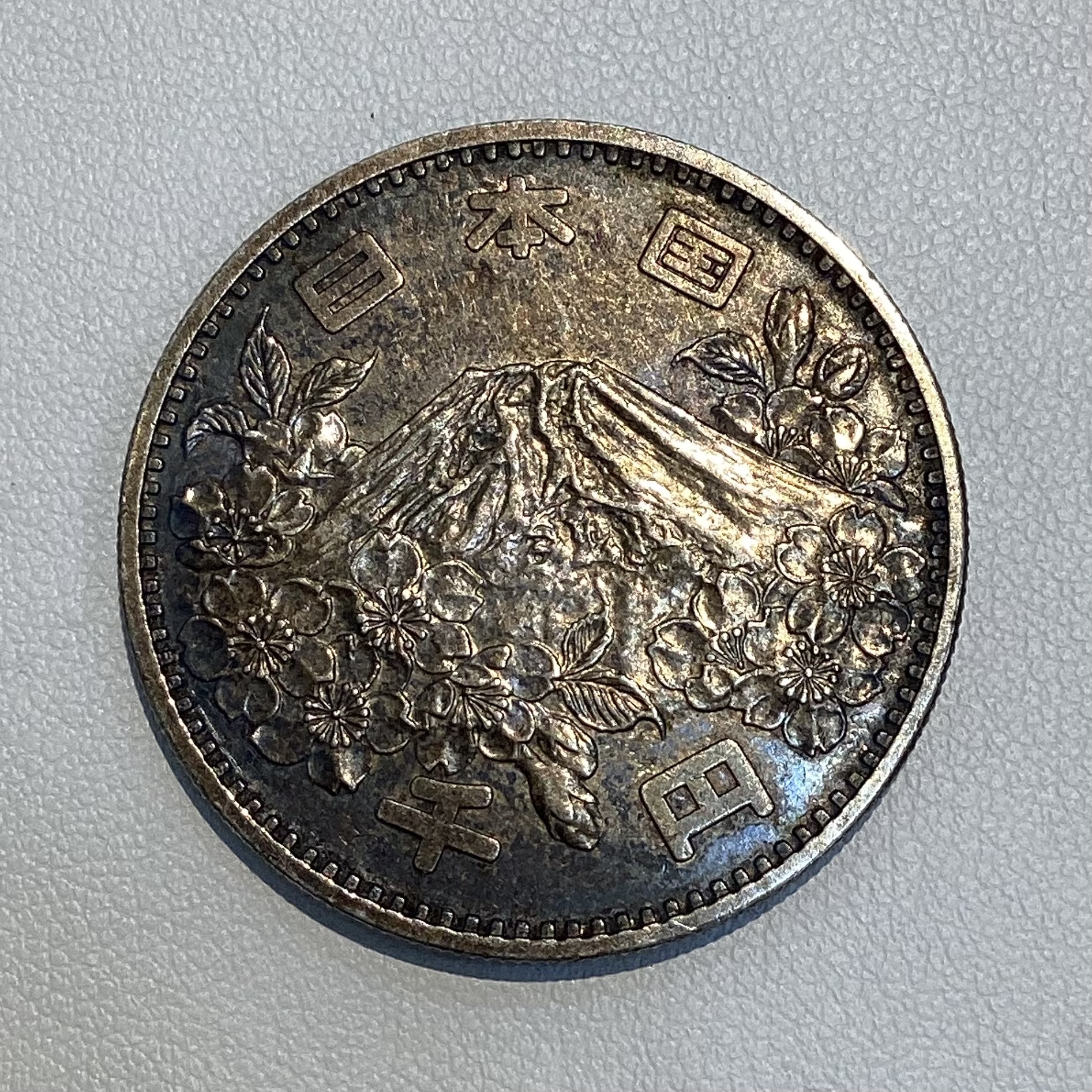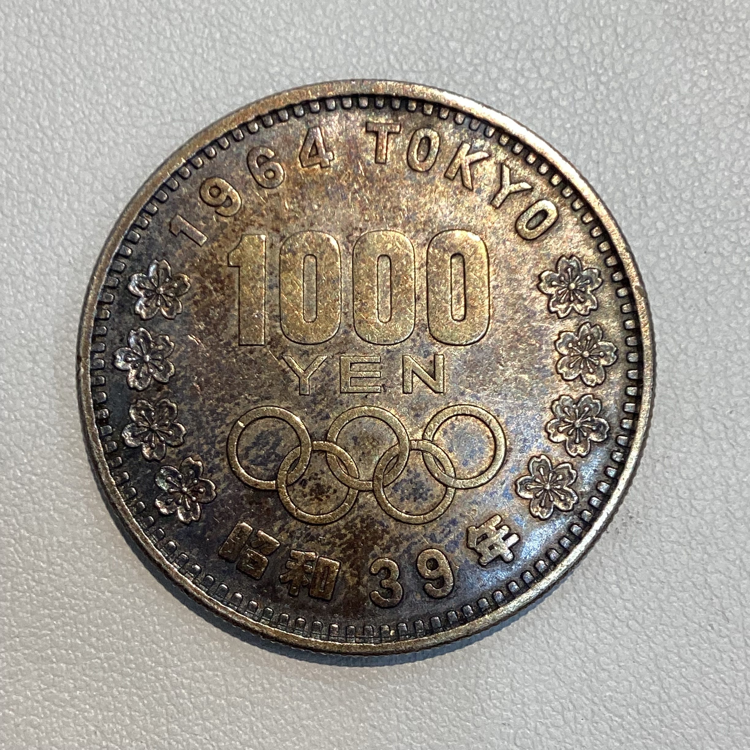 昭和39年、東京オリンピックの際に発行された記念硬貨で、日本の象徴である富士山と国花の桜をあしらわれたデザインが特徴です。