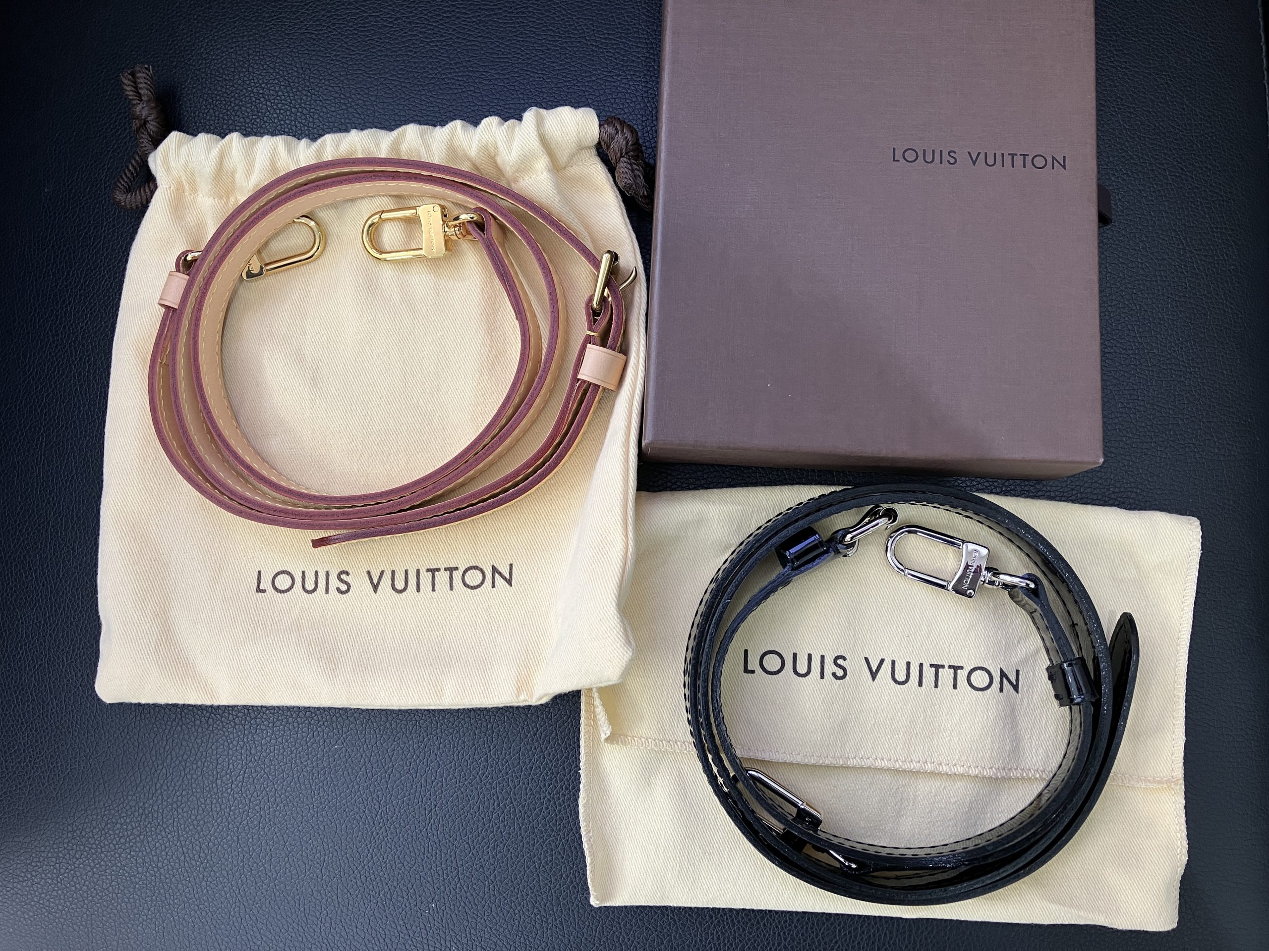 箱付きエナメルストラップとモノグラム製品には欠かせないヌメ革素材の細いストラップ2種です。