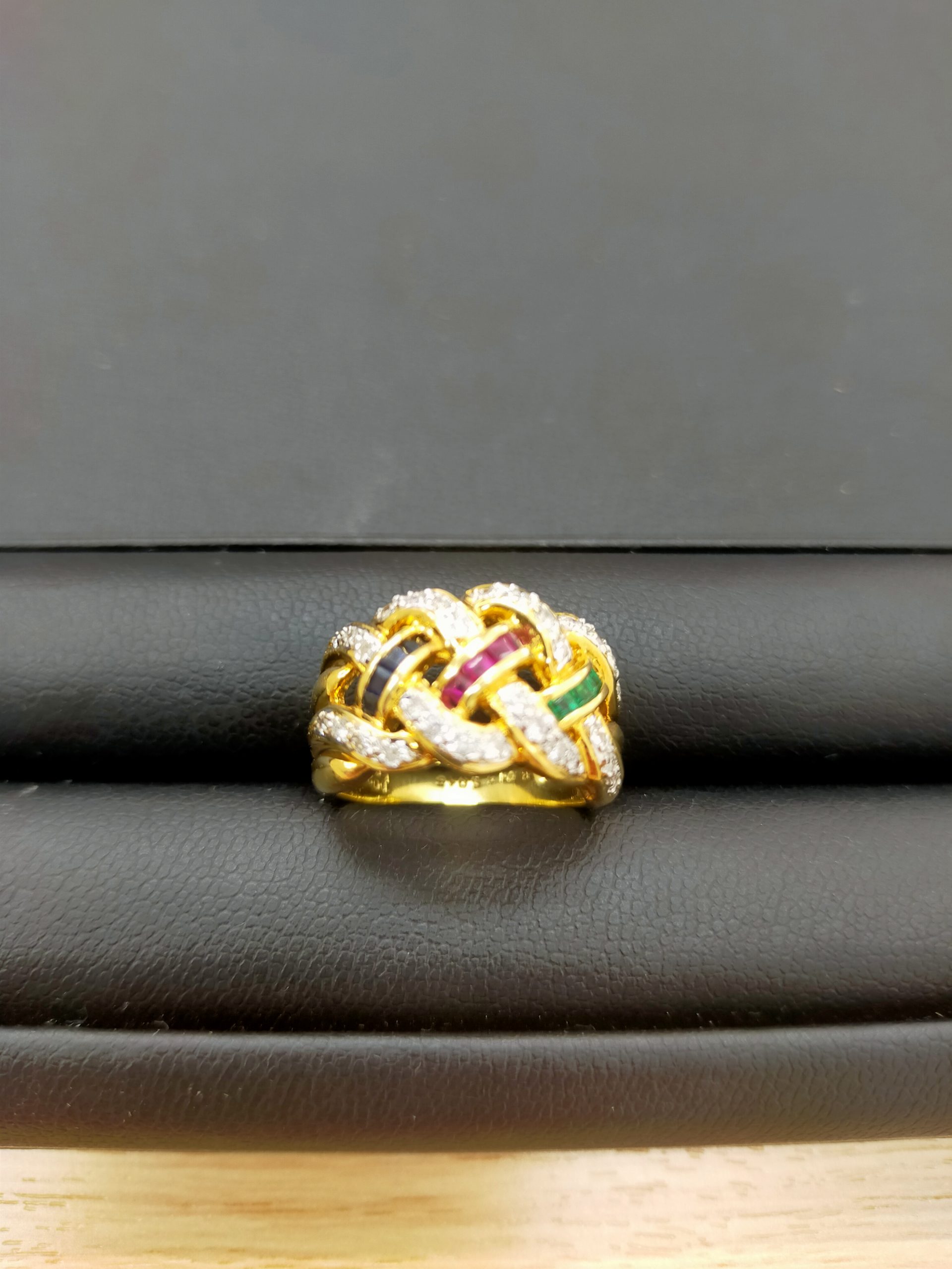 本日はこちら、ダイヤにルビー・サファイア・エメラルドがあしらわれた18金のリングを高価買取させて頂きました!