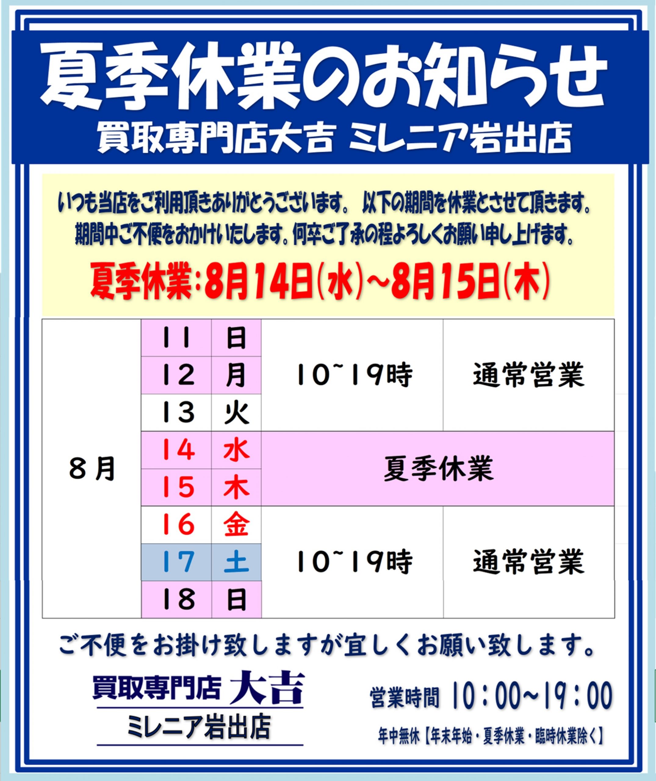 買取大吉» 店舗紹介» ミレニア岩出店» ミレニア岩出店 店長ブログ» 大吉ミレニア岩出店【夏季休業のお知らせ】
