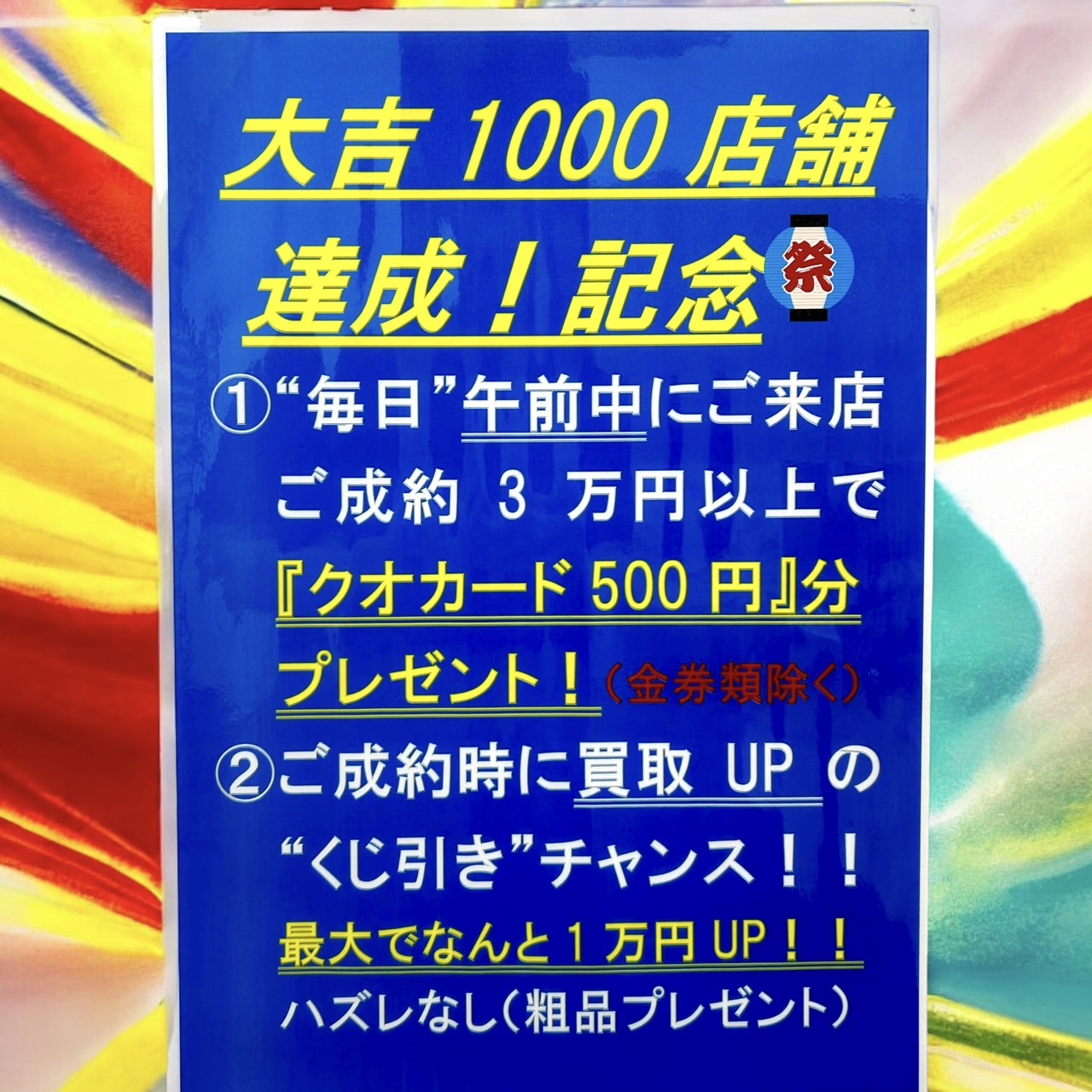 買取大吉1000店舗達成を記念いたしましてQUOカードプレゼント&くじ引きの特典をお付けします🙆