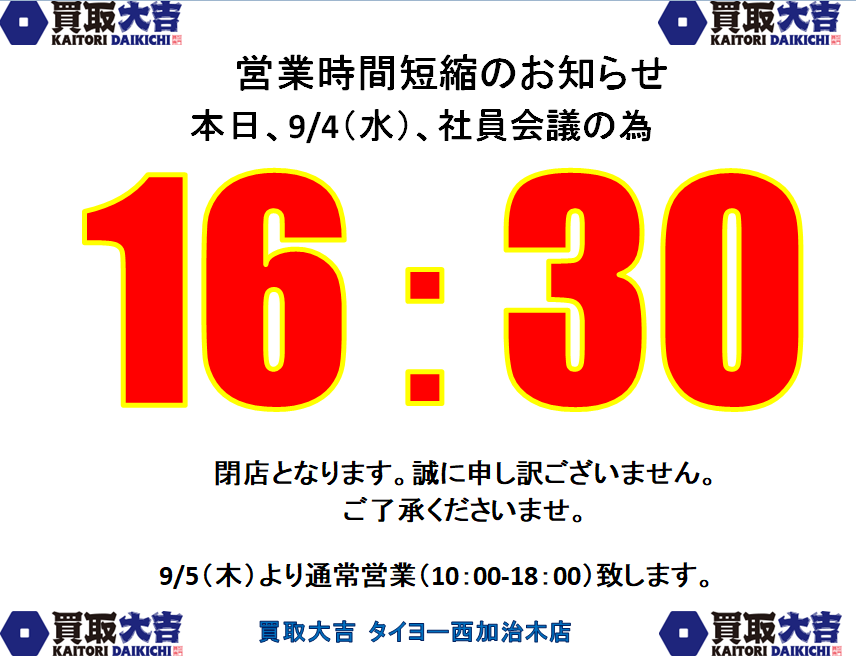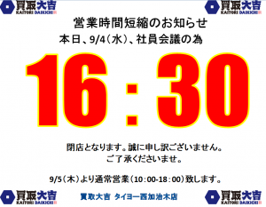 本日9/4(水)の姶良市・買取大吉タイヨー西加治木店、営業時間に関しまして | タイヨー西加治木店