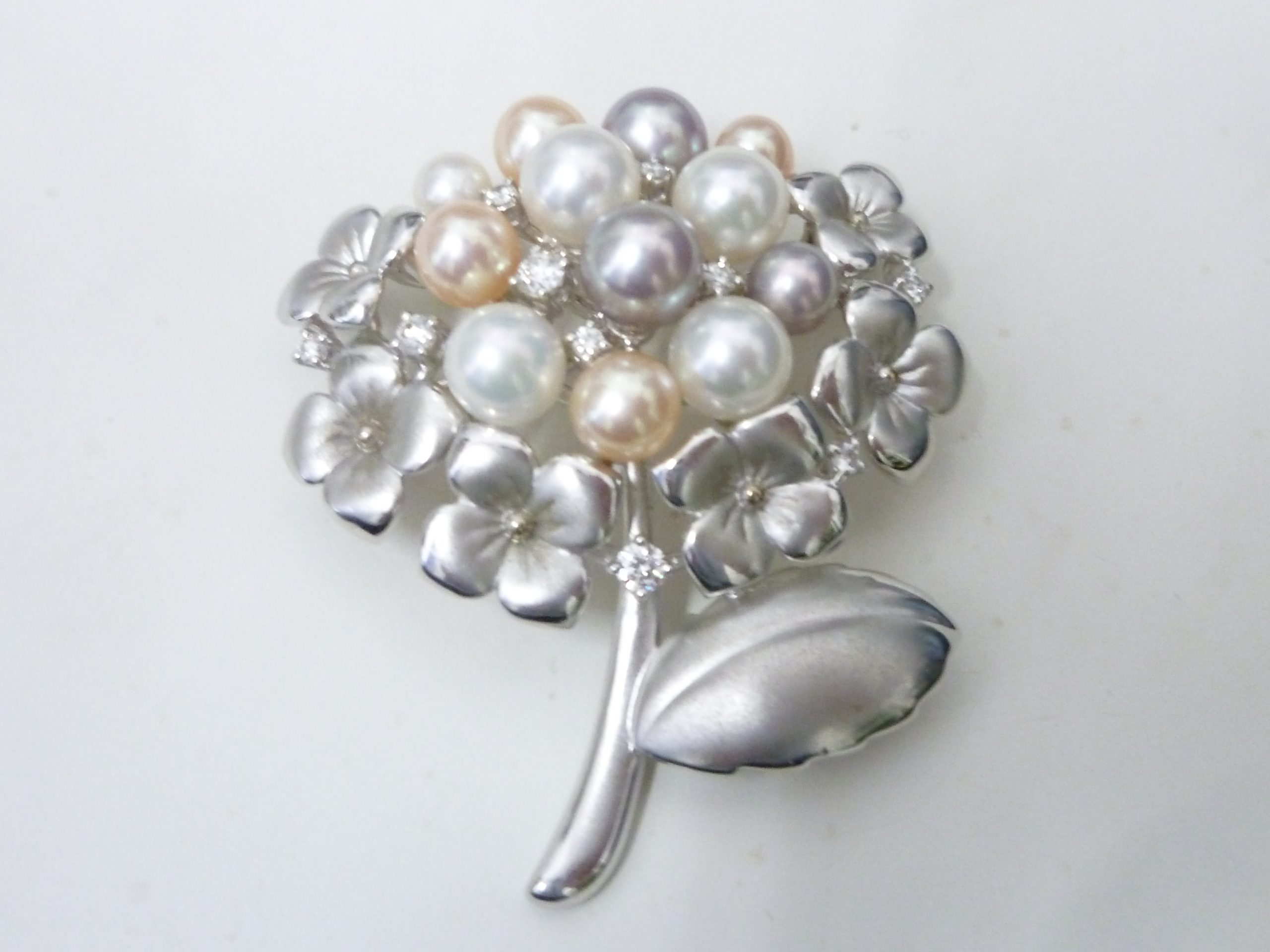 プラチナで茎や葉、花が綺麗に細工されており、そこにホワイトパールや