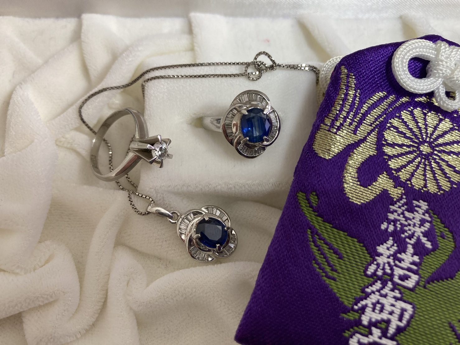 本日は、お母様のご遺品の整理査定ということで、K18ホワイトゴールドのダイヤ・サファイアリング・ネックレスとPt900ダイヤリングをお買取りさせていただきました。