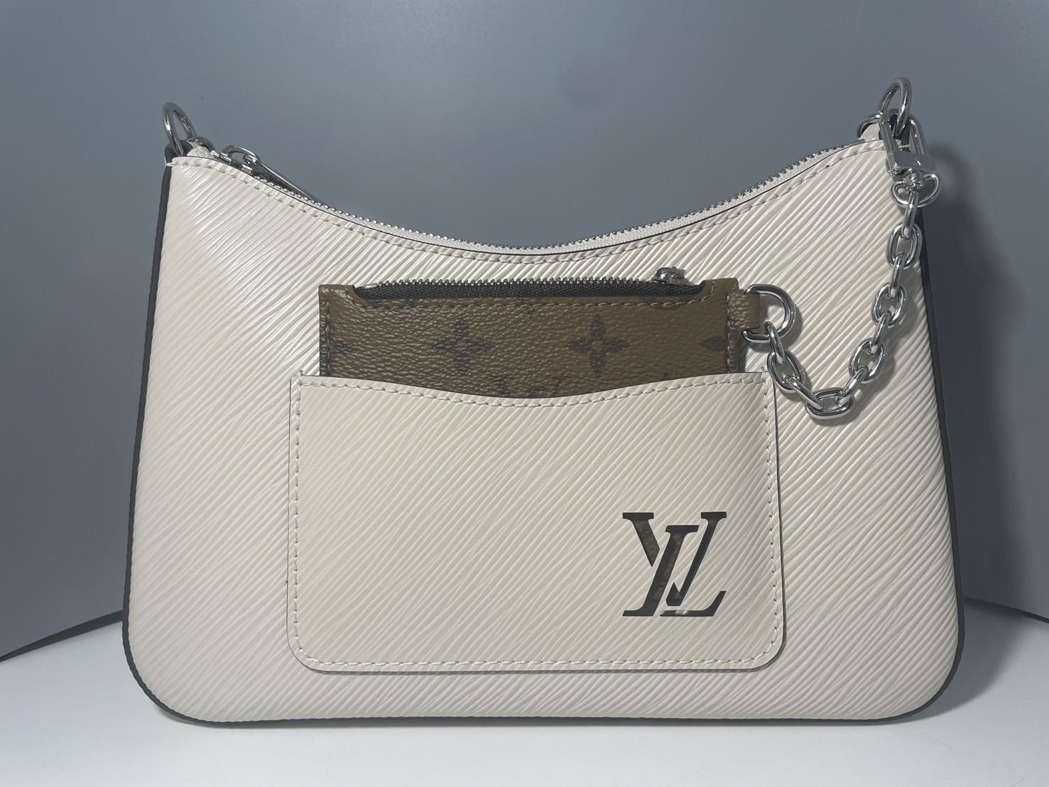 『マレル』は、キャンバス生地の小ぶりなポーチで、バッグ本体はシルバーカラーのチェーンと繋がっているのが特徴です。チェーンは取り外すことも、バッグのフロントポケットに入れることも可能。 フロントポケットにあしらったLV イニシャルのカットアウトから、ポーチのモノグラム・パターンがさりげなく見えるデザインもポイント。