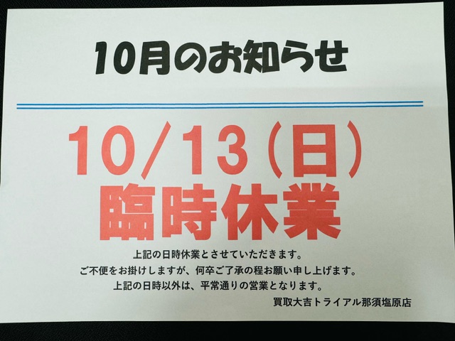 本日10/13(日)臨時休業です!! 買取大吉トライアル那須塩原店 | トライアル那須塩原店