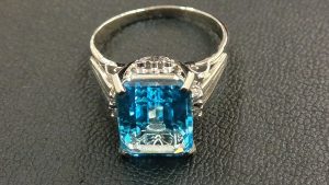 この、綺麗な石はブルートパーズとダイアモンドです。クールな佇まいです。