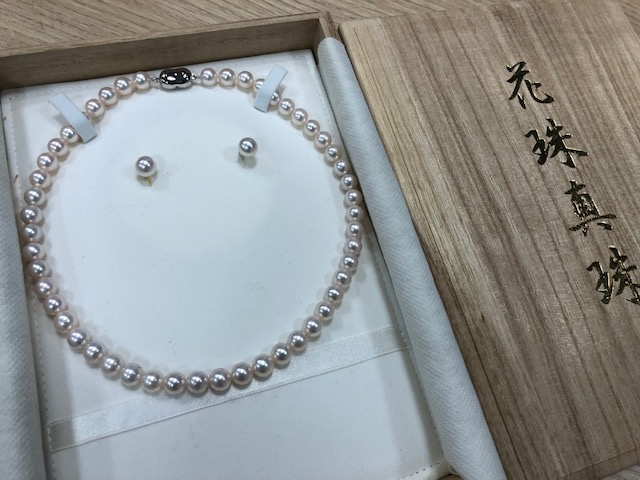 花珠真珠ネックレスとピアスのセットをお買取させていただきました。 真珠アクセサリーのお買取も行っております。真珠鑑定書もございましたら一緒にお持ちください。売却ご検討中のお品物がございましたら買取大吉まで是非お越しくださいませ。 | 上田天神店