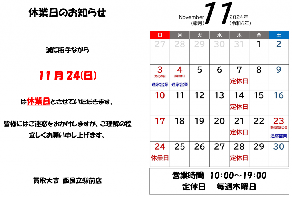※誠に勝手ながら、11月24日(日)は休業日とさせていただきます。