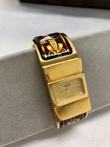 ベルト部分には馬柄が七宝焼でデザインされた時計のロケ。