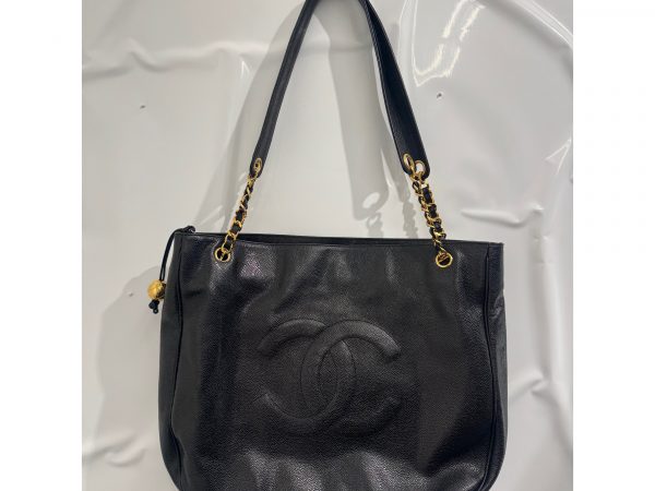 画像は、ボールチャーム付きのキャビアスキン(カーフスキン)トートバッグです。