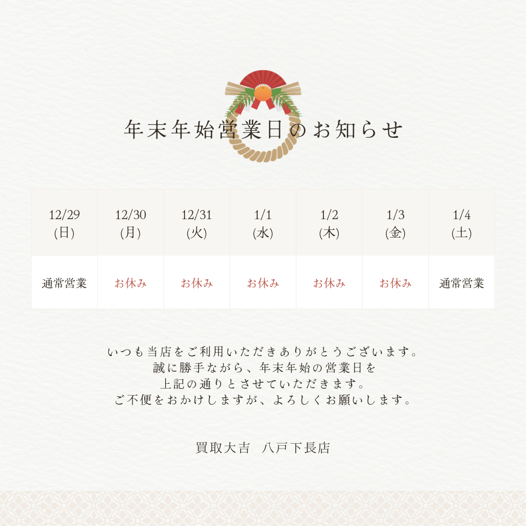 年末年始休業のお知らせ | 八戸下長店