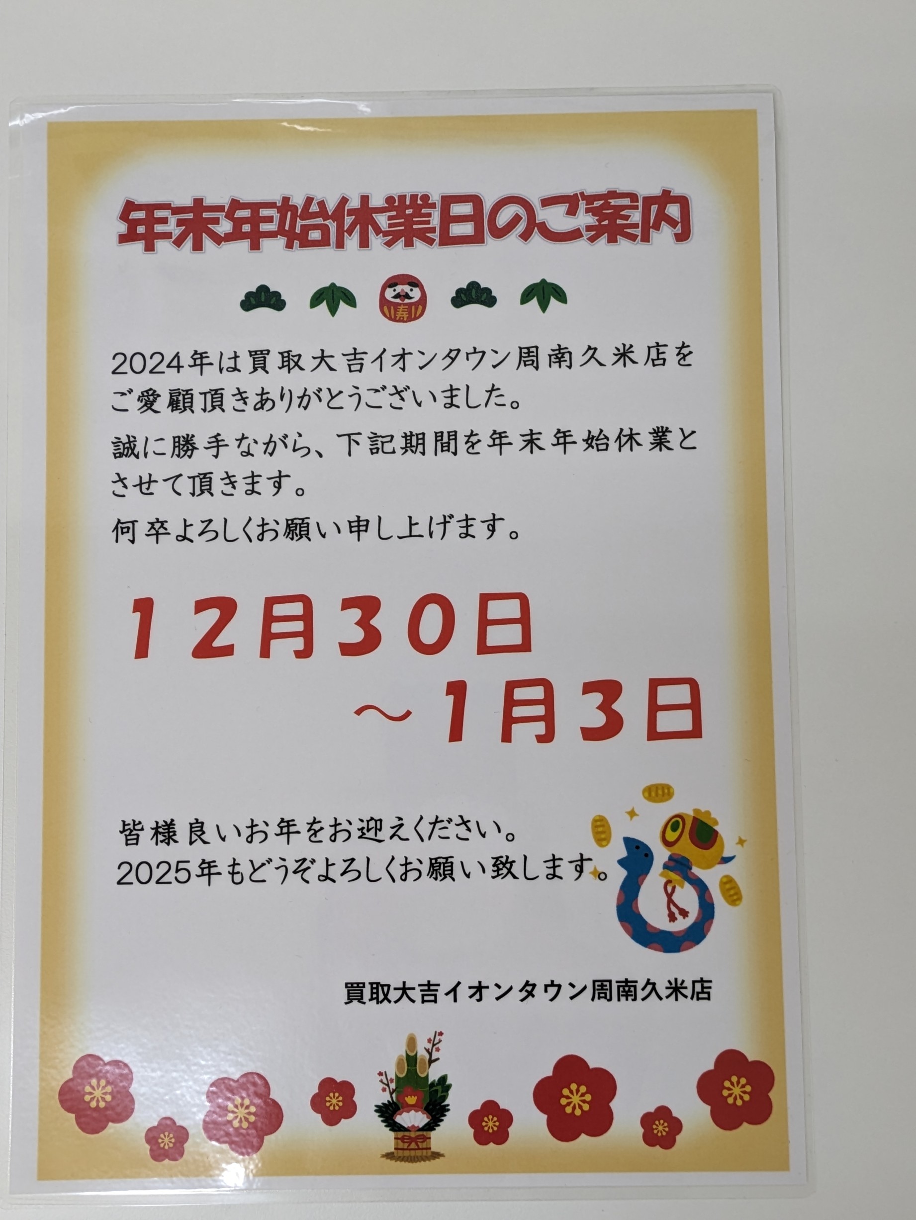 買取大吉» 店舗紹介» イオンタウン周南久米店» イオンタウン周南久米店 店長ブログ» 年末年始休業日のご案内 12月30(月)~1月3(金)