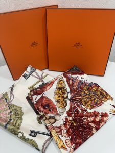 エルメスのスカーフは綺麗で大人っぽい雰囲気のものが多いのでピッタリですね✨